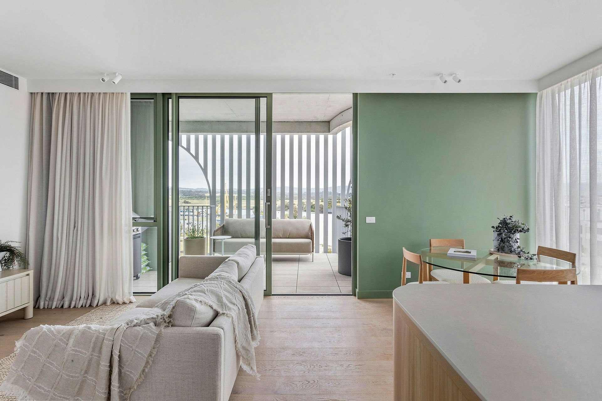 Reimagined as a series of coastal homes, the interior of Osprey apartments reflects a sense of warmth and timeless restraint. Stark white finishes are thereby replaced with eggshell tones of light cream for a neutral textured palette. Details and materials such as cover batten wall linings, accents of hardwood timber and pale green internalise what is typically seen on the outside of a building. A return to simple coastal living with airy light filled internal spaces- unfussy, yet refined.
